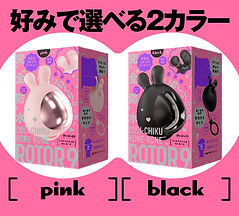 ピンクとブラックの2カラー展開。どちらのカラーもポップでキュート♡アダルトグッズには見えないので持ち歩きに便利。あなた好みのカラーをお選びください。※本商品のピンクは、撮影時の光の加減や、ご覧頂いているスマホやパソコンによって、実商品の色味と若干異なる場合がございます。