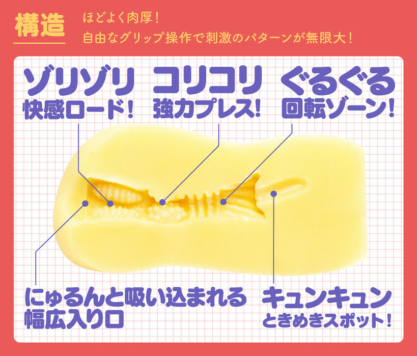 圧倒的なザラっとした刺激と、ギュッギューっとした密着感が特徴の「ZARA GYUGYU」は、数の子天井を思わせる無数の粒イボにヒダが複雑に絡み合った無次元構造ホール。内部は上下左右に入り組んだ構造で、掻き分けるような抵抗感と高い密着感を味わえます。外装には六角形のグリップパターンを施し、濡れた手でもズレにくい設計に。長さ175mm・重量460gのロングボディで先端から根本まで快感を感じてください♡
